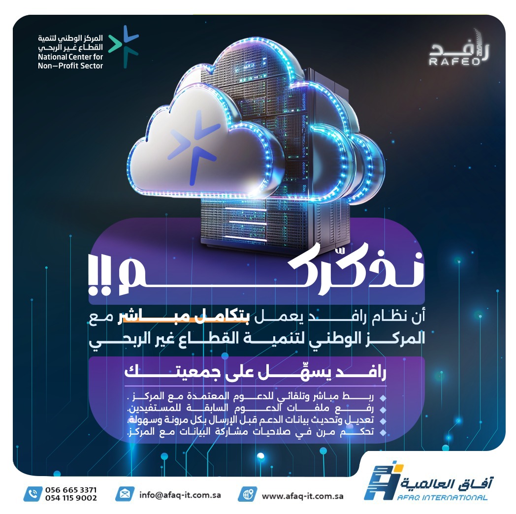 فى الأونة الأخيرة اعتمد كثير من الجمعيات نظام رافد الذى يعد نقطة تحول فى الميدان الخيرى حيث هو لبنة مهمة جدا فى تاريخ التحول التقنى إذ يعتمد على فريق دعم محترم يقدم أفضل الحلول ومخططات سير العمليات وتوزيع المهام واعتمادها وهى التى من خلالها استطعنا تحقيق نجاحات متميزة فى الموارد المالية وفى إدارة الخدمة المجتمعية وفى ضبط إدارة الموارد البشرية وتنظيمها.